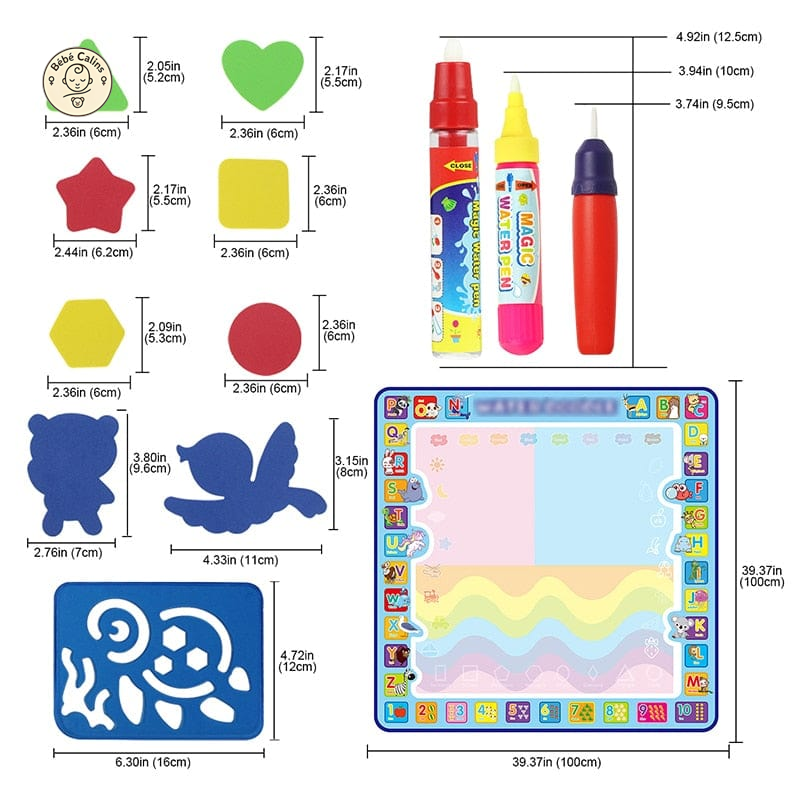 - Contenu du paquet : Varié selon le type, incluant tapis de dessin, stylos magiques, brosses, tampons EVA, modèles en plastique et un livre d'instruction.